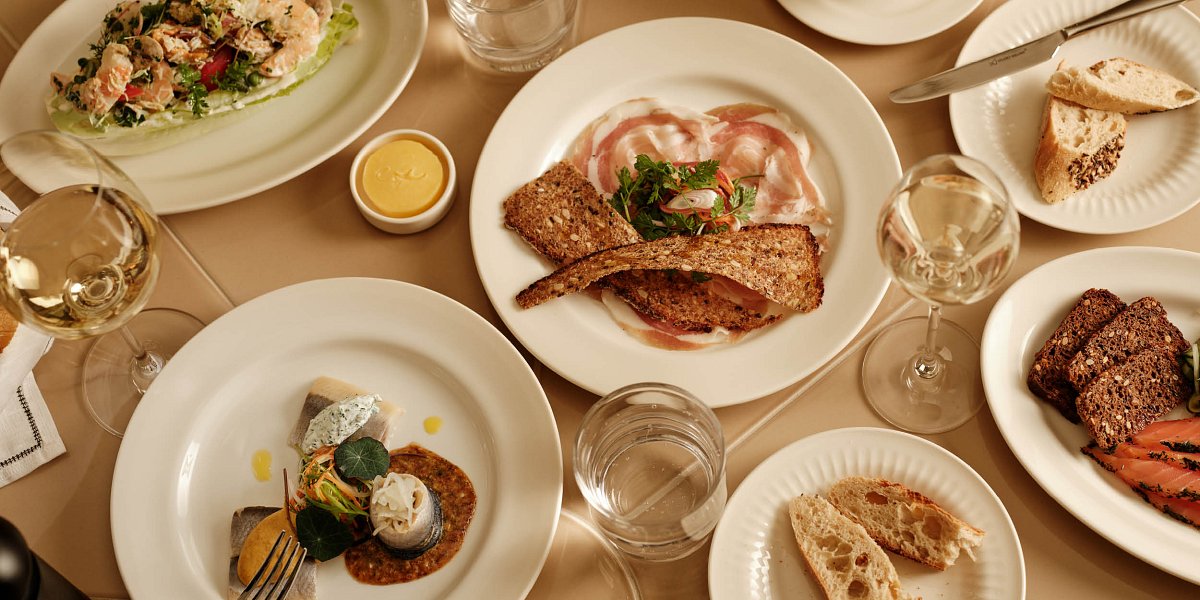 Dishes include Gravlax with fermented cucumber salad; Västerbotten cheese tart with smoked onion purée and broad beans; and West Coast Salad with shrimp, mussels, crab and mushrooms.