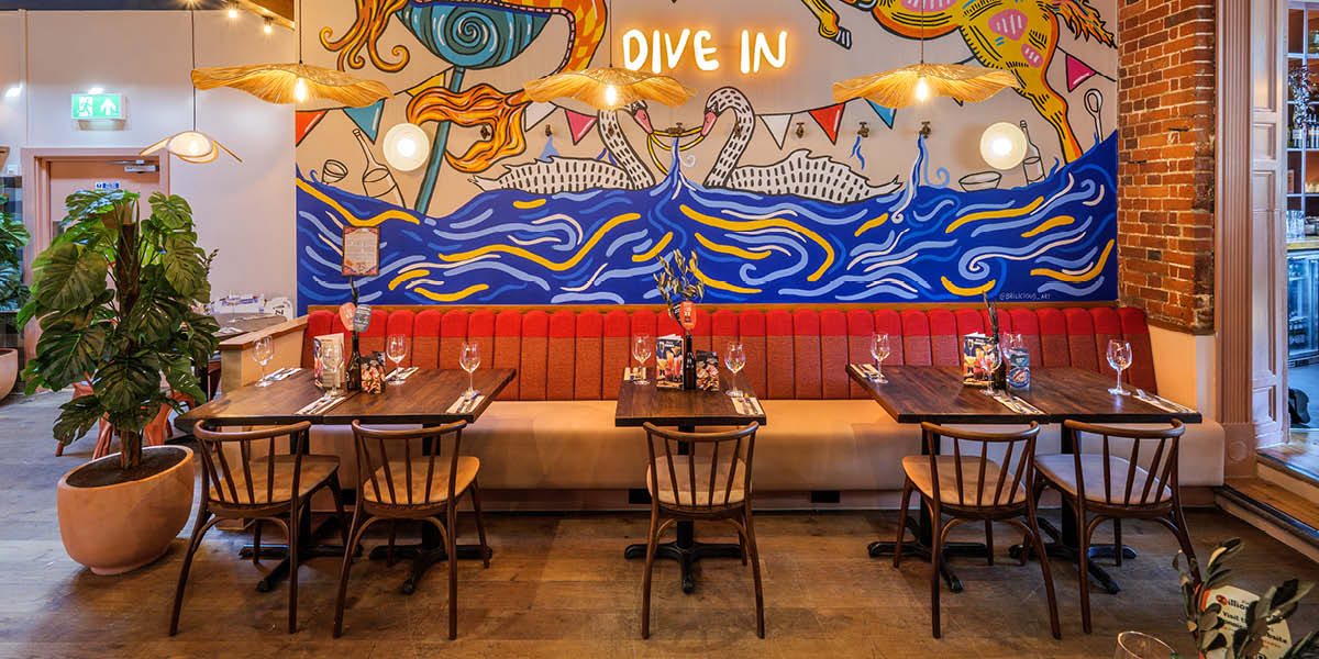 Pia Fairhurst (PF): Our key priority for Zizzi Marlow was to bring to life the new 'Stand Out Italian' concept in a way that felt vibrant, playful and hyper-local. We wanted to create a space that felt unmistakably Zizzi, but also unmistakably Marlow. This meant integrating bold styling – like the yellow feature tree, quirky stickers and Tuscan-inspired colour palette – with nods to the town's rich heritage, such as the rowing legacy and Swan Upping tradition. It was also essential to work sensitively with the building's listed status, ensuring that original features were celebrated and complemented, not overshadowed.